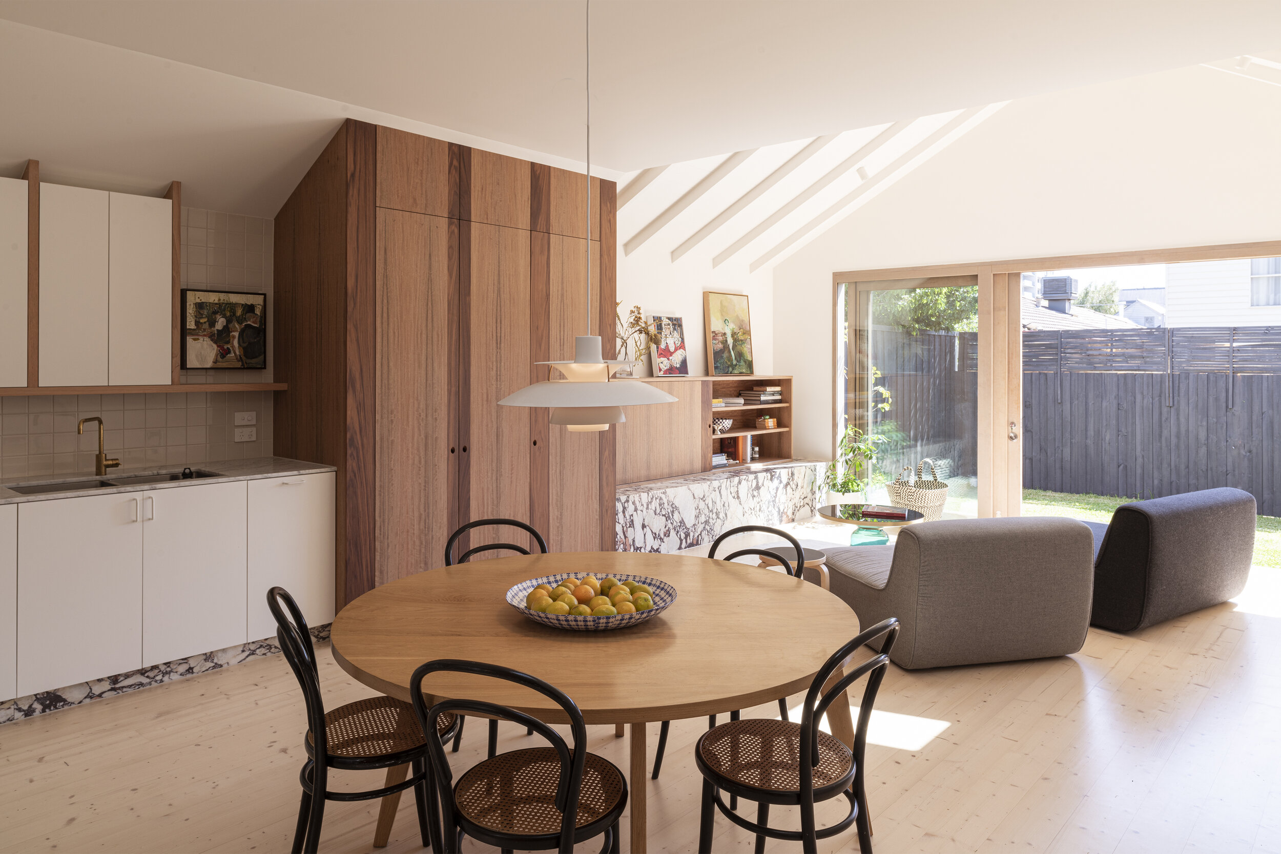 ‘A starting point for a growing family, this worker’s cottage in inner Melbourne comprises a minor addition stitched into the existing fabric with the new parts illuminated via detailing and materiality. We have vigorously detailed the interior spaces to make the most of the small footprint available.’